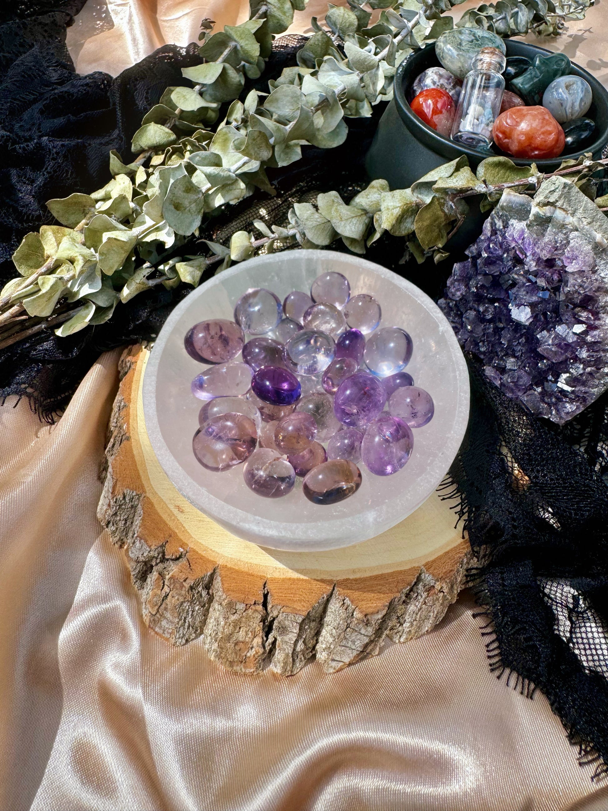 SOME TUMBLES ARE AMETRINE. TUMBLES VARY IN SIZE (SHOWN IN PHOTO 2) & COLOR FROM PALE TO DARK PURPLE, AND/OR HAVE CITRINE HUES.